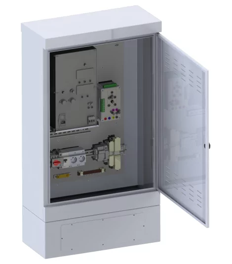 Die Gleichrichterstation ist in einem X3-Aluminium-Metallschrank im Format BC400 untergebracht.