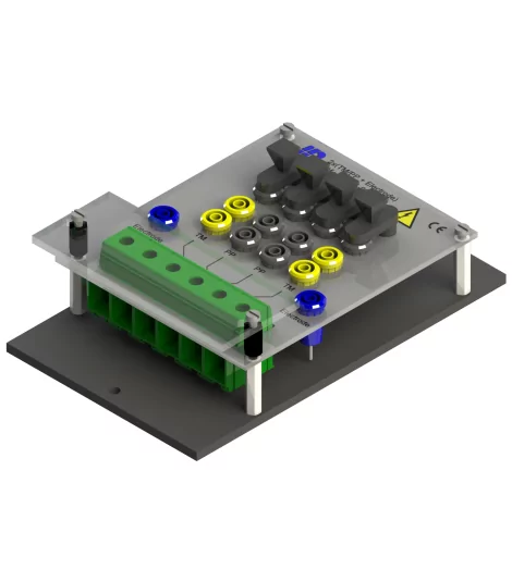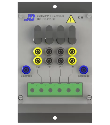 Connection plate with 4 ways identified TM (Corrosion Measurement) and PP (Pipe Potential), two electrode connectors, an a common electrical path.