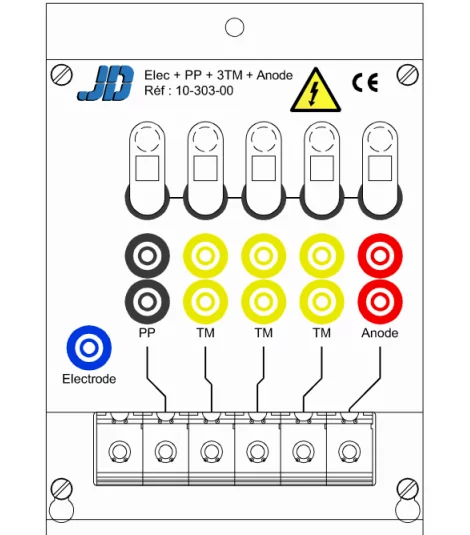 Connection plate with 5 ways identified PP and 3 x TM + ANODE, one electrode connector, and a common electrical path.