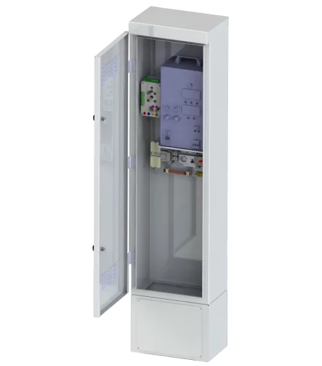 The rectifier station 1450 CITY is installed in an ALUMINUM cabinet. The rectifier station allows the reception of a rectifier and guarantees its protection against overvoltages, overcurrents and the effects of lightning.