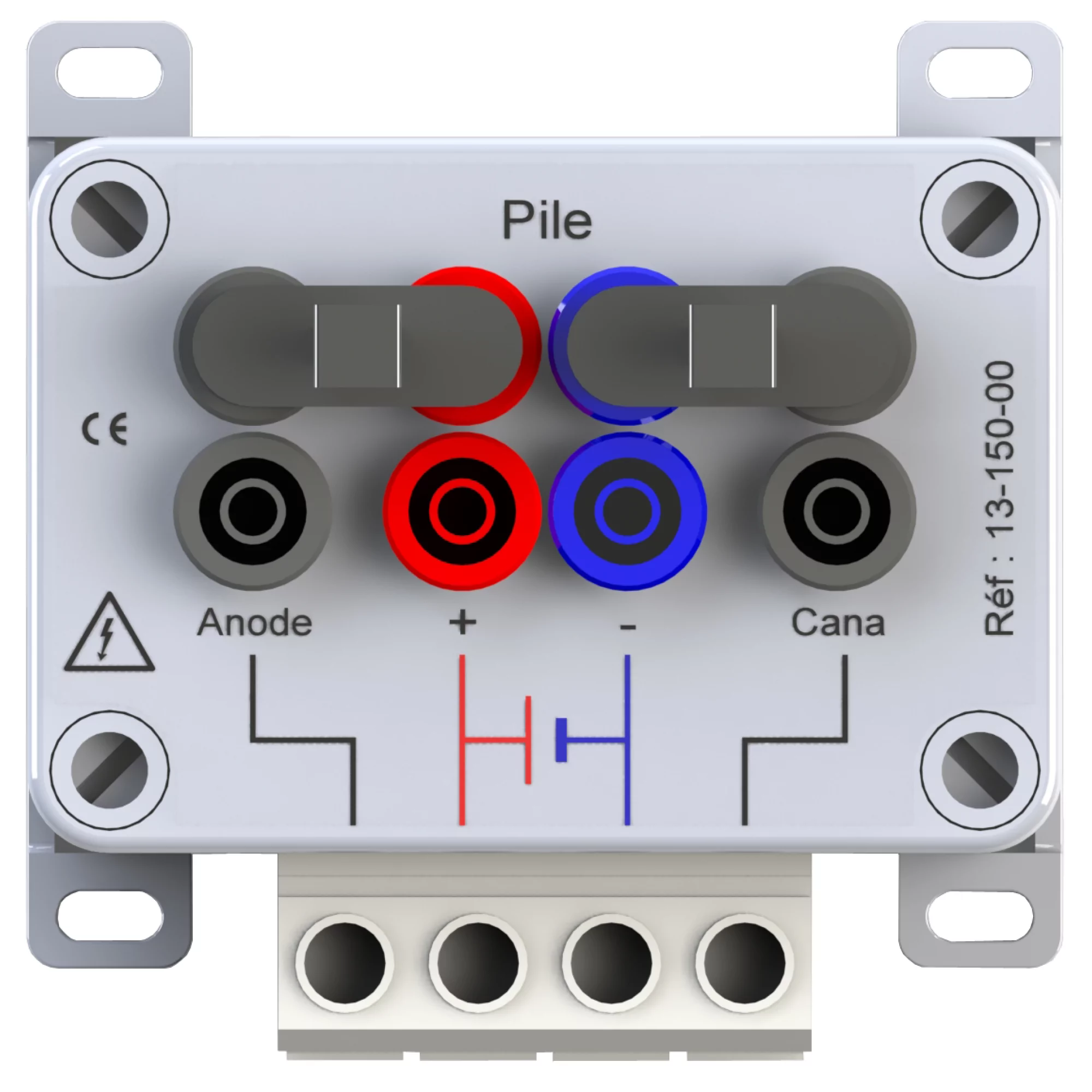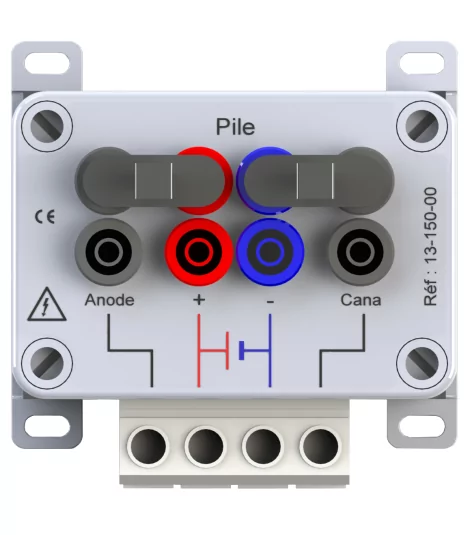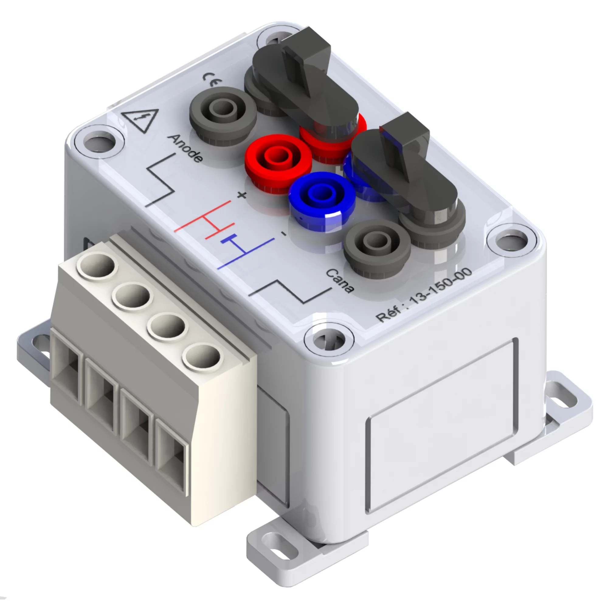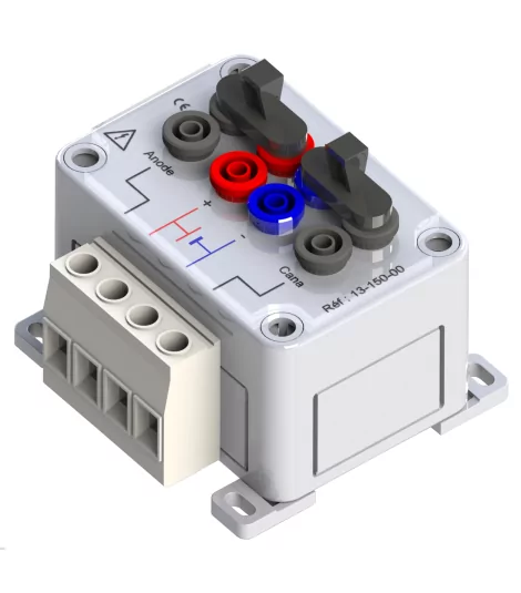 Boîtier de connexion pour piles, anodes et canalisation. En polycarbonate, cavaliers amovibles, bornier 4 × 16 mm², compatible borne PVC.